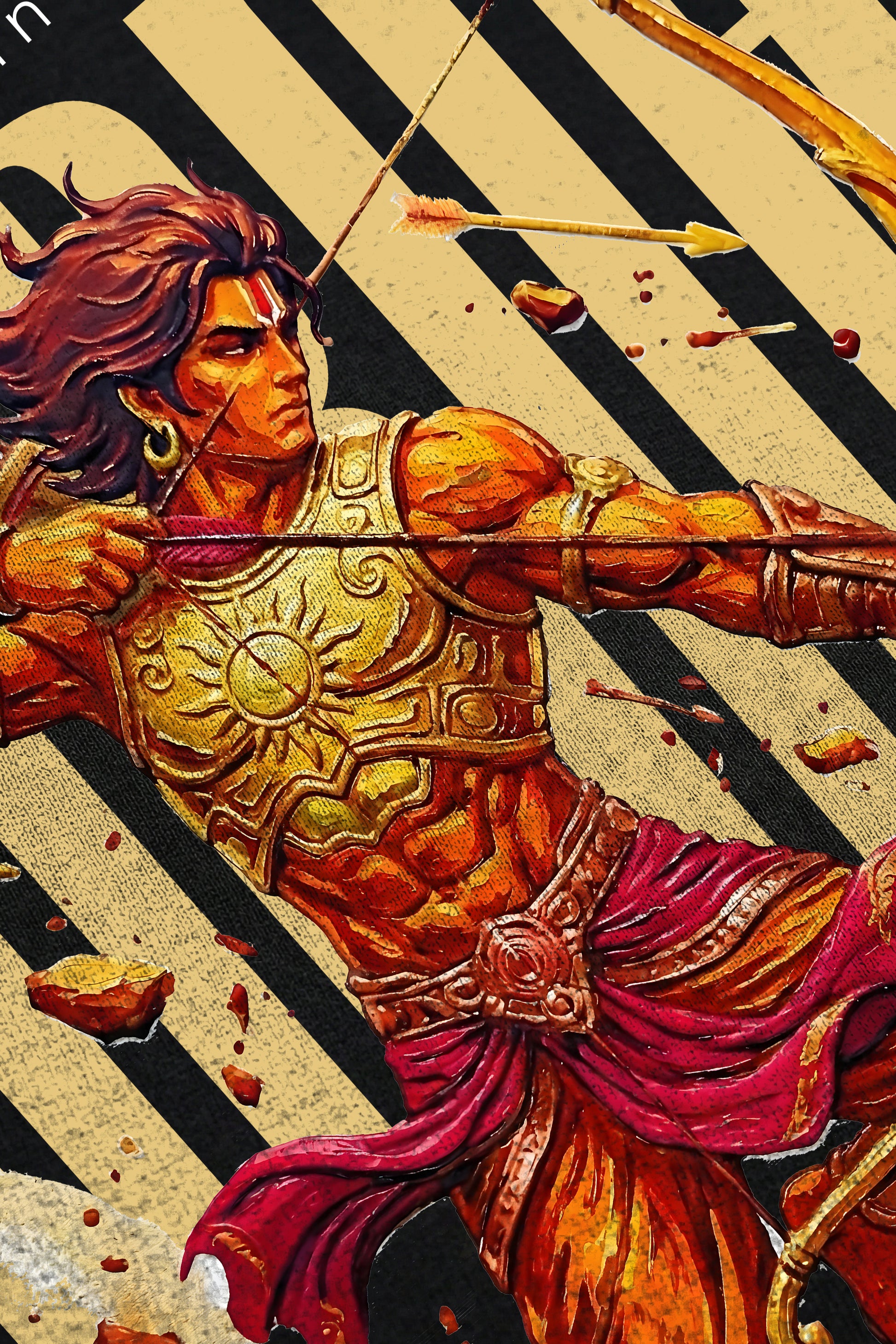 Inspired by the legendary archer Karna, this powerful design captures the essence of strength, loyalty, and unmatched skill. The artwork showcases Karna in a fierce battle stance, bow drawn, arrows flying, and flames erupting beneath him, symbolizing courage in the face of destiny.