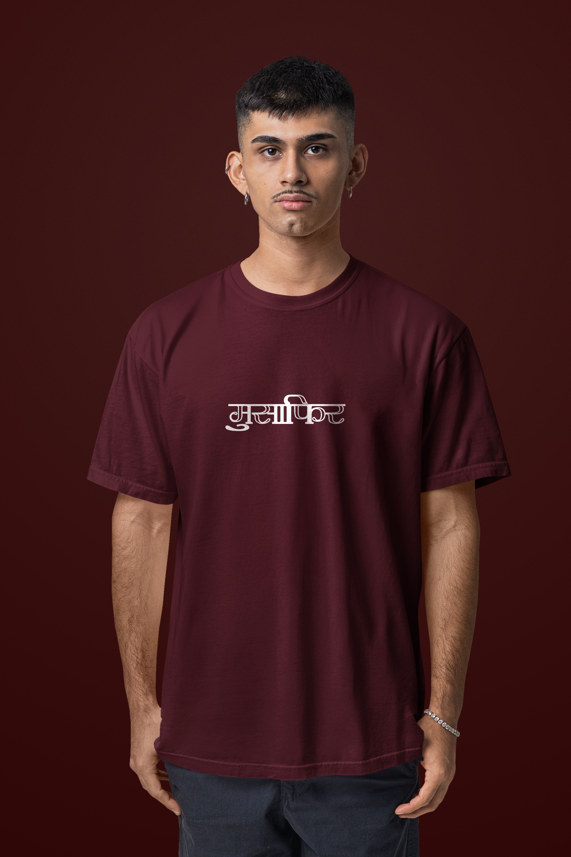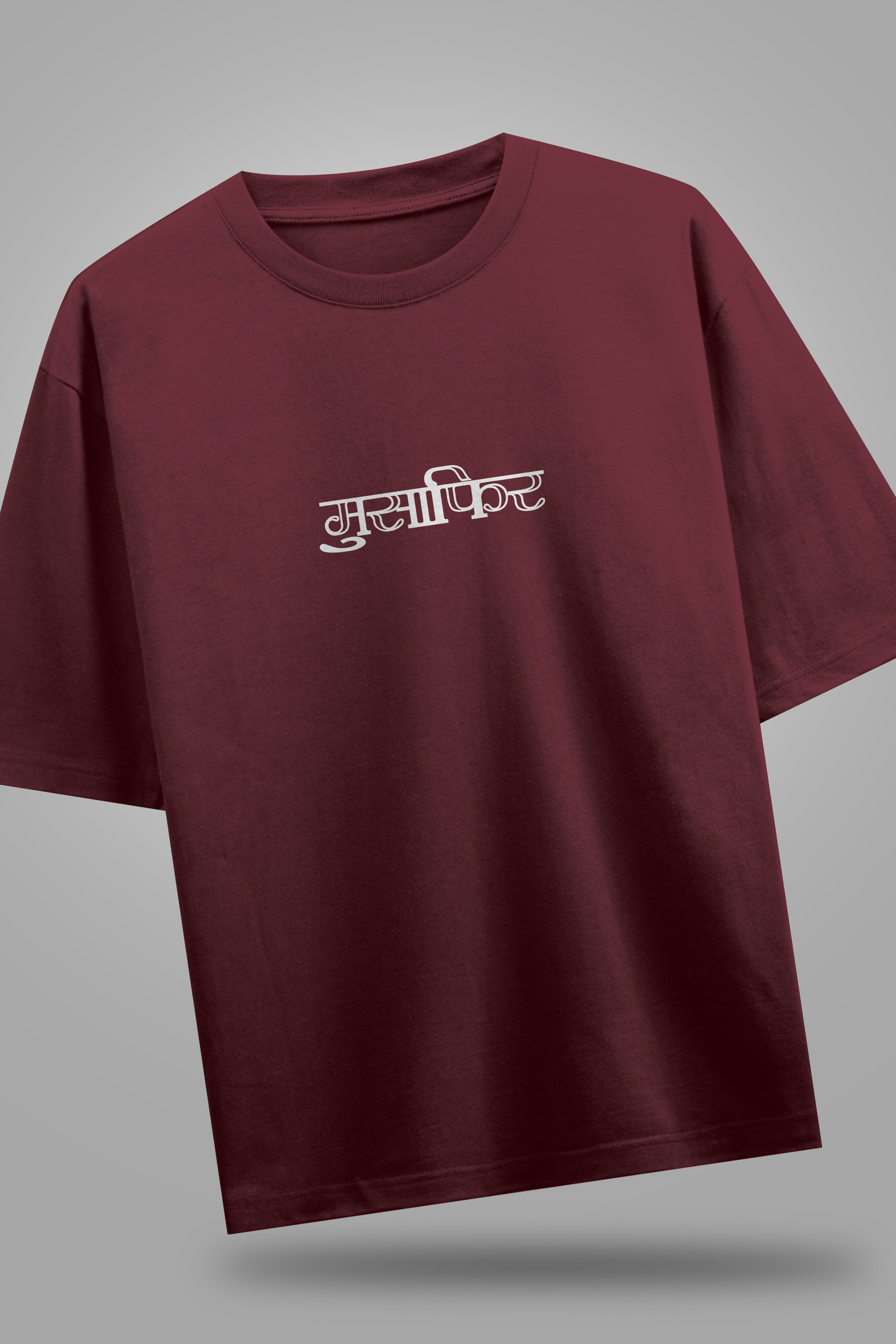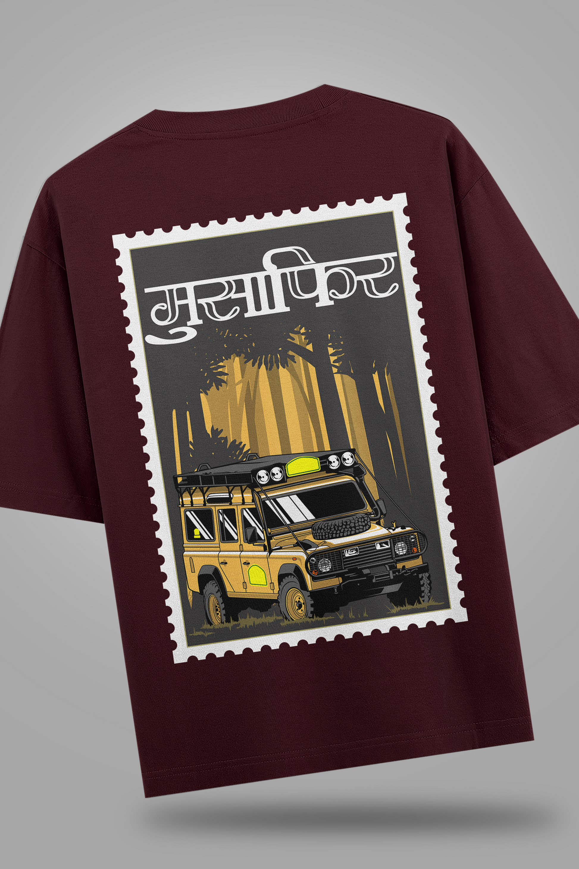This maroon oversized Musafir Graphic T-shirt is designed for true wanderers, featuring the Hindi word “मुसाफ़िर” (meaning traveler) on the front in a bold minimal style and a stunning graphic on the back showcasing an off-road jeep in the wilderness framed like a vintage postage stamp, symbolizing exploration and adventure; crafted from premium 100% cotton, it offers a soft, breathable, and durable feel with high-quality prints on both sides, making it perfect for travel lovers, adventurers, and streetwear enthusiasts who believe life is a journey.