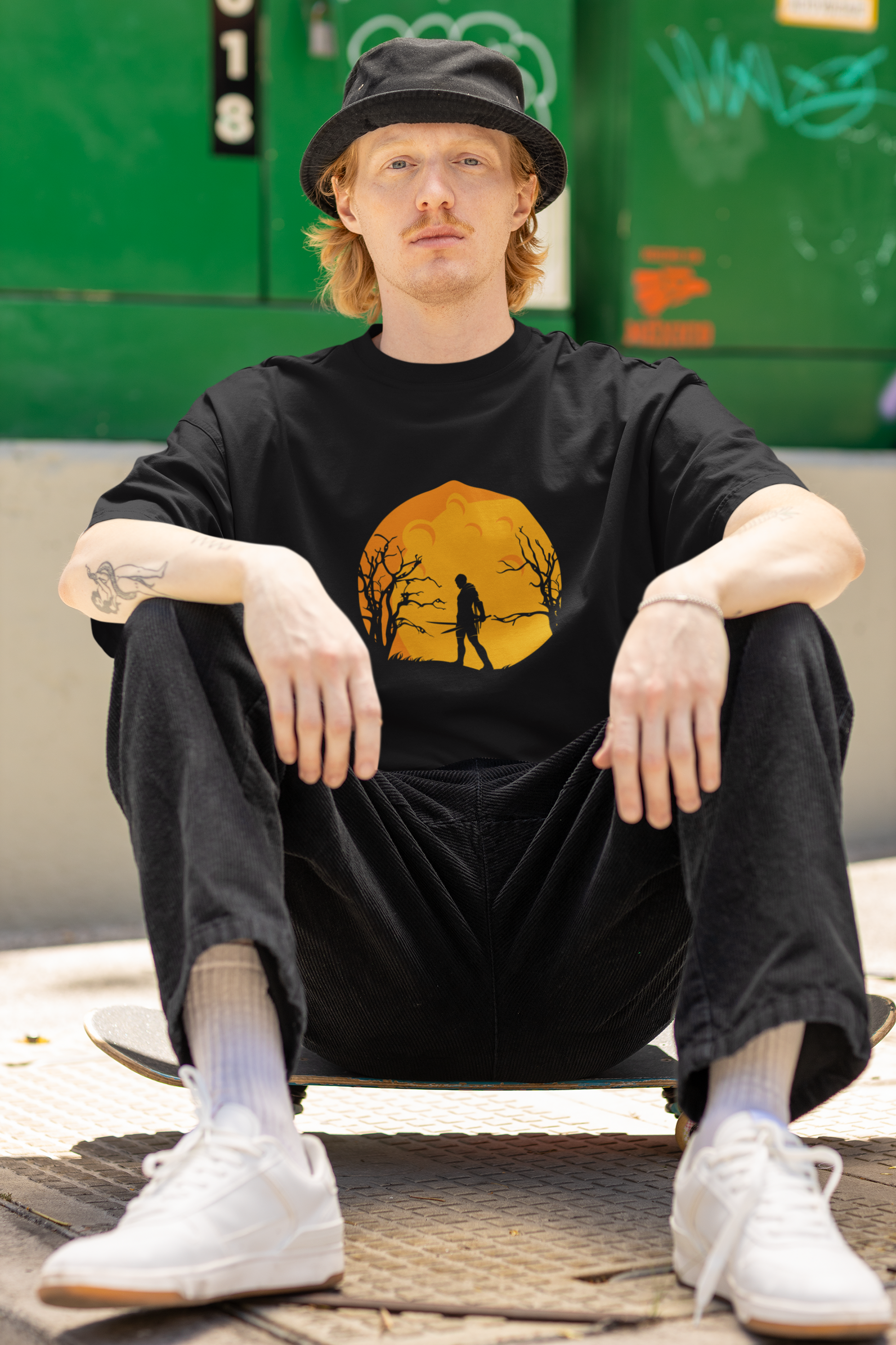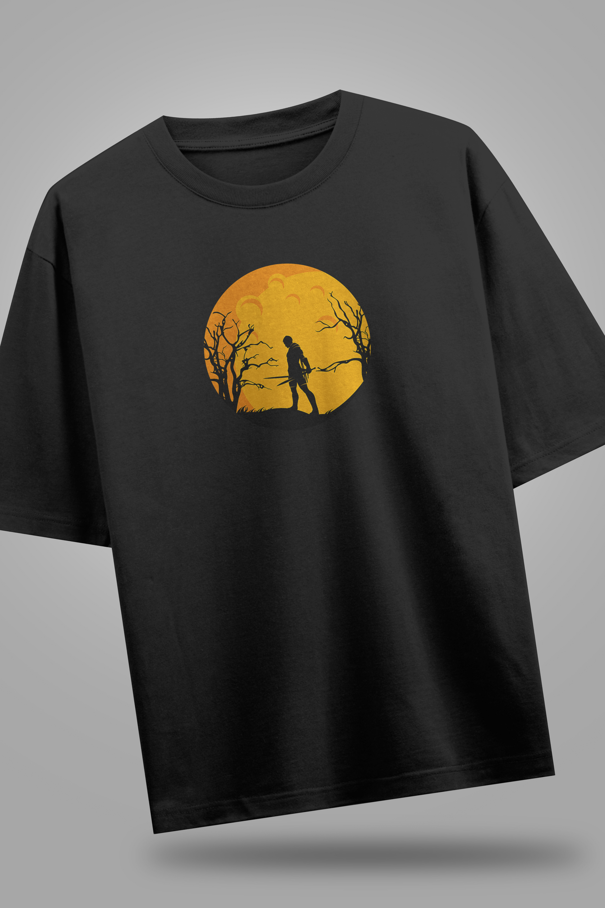 Unleash the fighter within you with our Warrior Oversized Tee. Designed with a bold silhouette of a lone warrior standing tall against a fiery orange moon, this t-shirt is more than fashion, it’s a statement of courage, resilience, and inner strength.